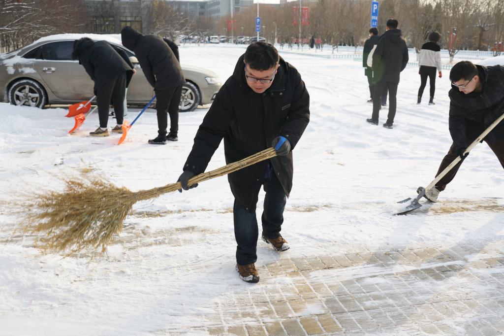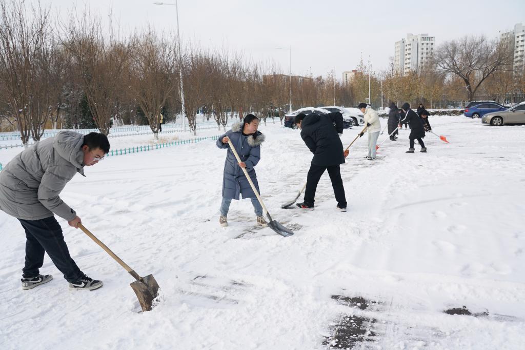 活动中,大家携带扫把、铁锹等除雪工具,按照公司网格责任区域划分来到兴文楼南侧停车场与德邻公寓9-11号楼附近,及时对积雪进行清除。在党委书记陈元的统筹指挥下,副经理耿华带领参加活动的师生们手持铁锹、扫帚,铲除积雪,清扫路面,分工明确,配合默契,干劲十足。经过一个多小时的奋战,基本完成负责区域内的积雪清扫任务。