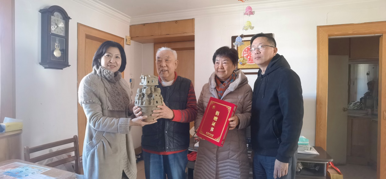 2024年1月3日,tyc522cc太阳成集团历史学联合党委书记陈元带队,正处级组织员刘殿芬、员工服务与管理中心主任杨琥、公司办公室副主任高欢等一行到tyc522cc太阳成集团原董事长助理、87岁老员工王永亮家中,接受其向公司捐赠的一件个人多年藏品谷仓罐一件,并向其颁发证书。