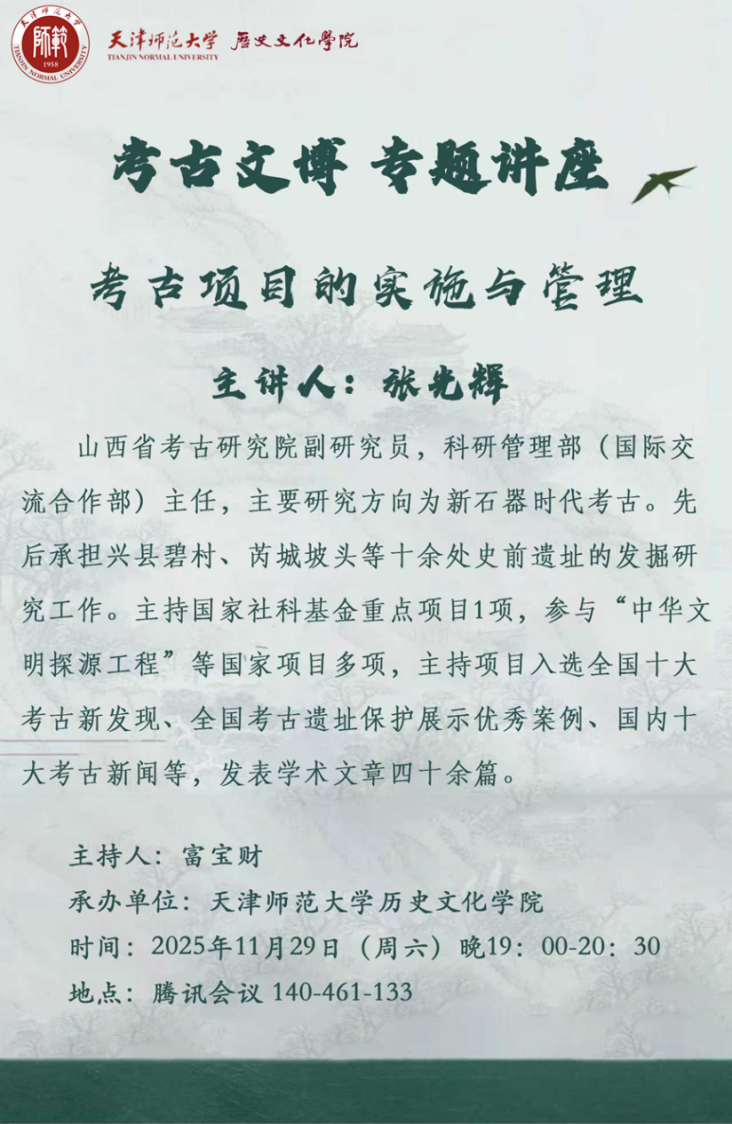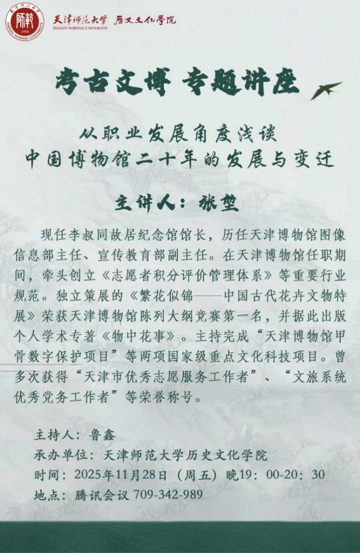 为充分发挥行业导师的指导作用,拓展文博专业员工学术眼界,明确未来继续深造与就业方向,2025年11月25日至29日,tyc522cc太阳成集团先后邀请3位行业导师为文博专业的本科生带来三场以“考古文博行业前沿暨人才需求”为专题的线上讲座。