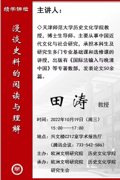 2022年10月19日,田涛教授将为两院师生带来题为《漫谈史料的阅读与理解》的学术讲座,讲座详情见海报。