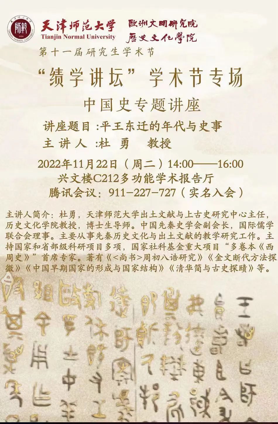 2022年11月22日,杜勇教授将为两院师生带来题为《平王东迁的年代与史事》的学术讲座,讲座详情见海报。