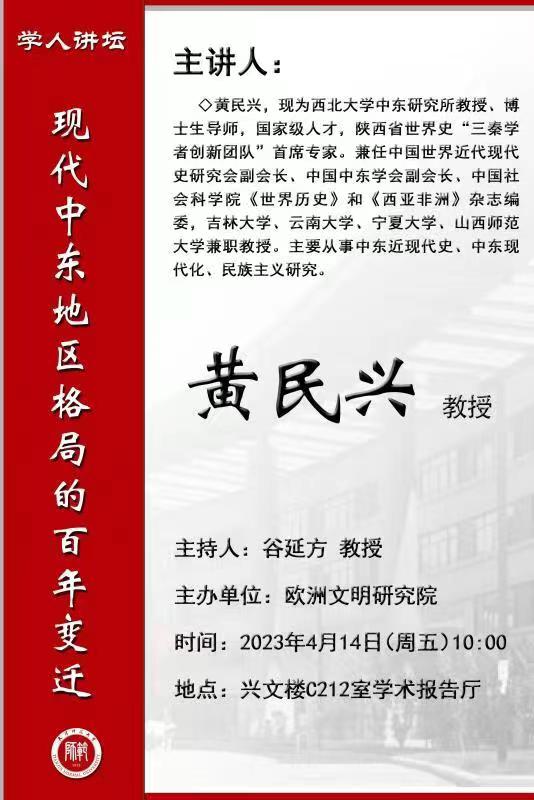 2023年4月14日,黄民兴教授将为两院师生带来题为《现代中东地区格局的百年变迁》的学术讲座,讲座详情见海报。