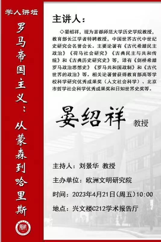 2023年4月21日,晏绍祥教授将为两院师生带来题为《罗马帝国主义:从蒙森到哈里斯》的学术讲座,讲座详情见海报。