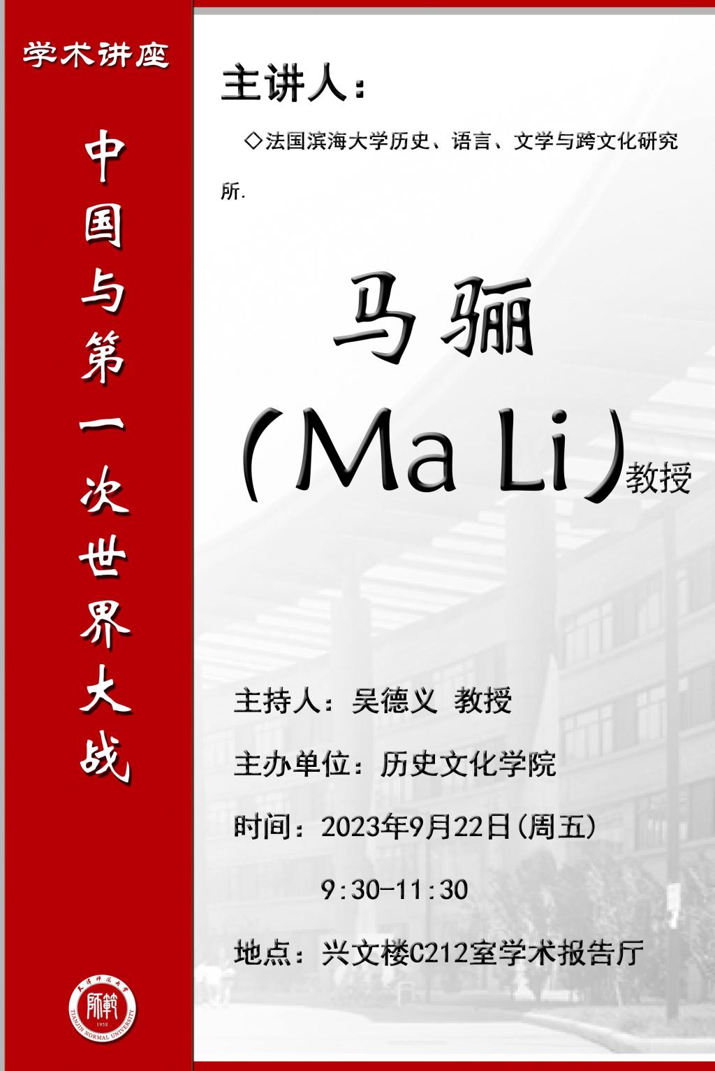 2023年9月22日,马骊教授将为两院师生带来题为《中国与第一次世界大战》的学术讲座,讲座详情见海报。