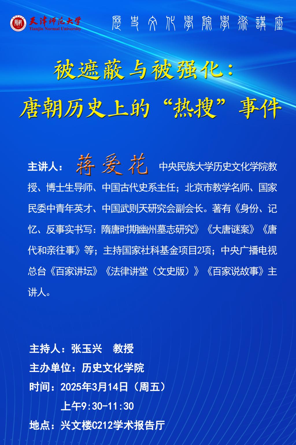 2025年3月14日,蒋爱花教授将为师生带来题为《被遮蔽与被强化:唐朝历史上的“热搜”事件》的学术讲座,详情见海报。