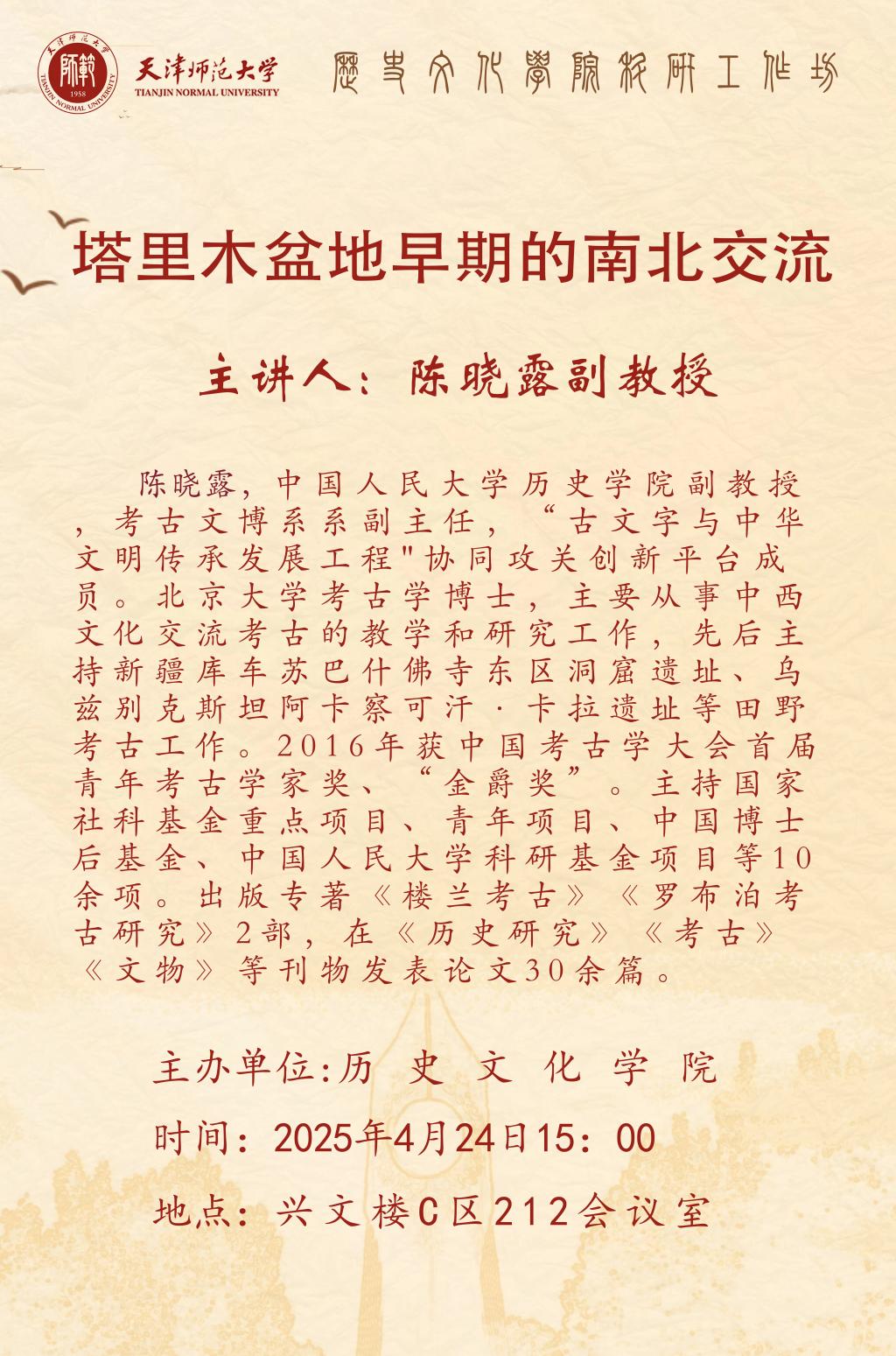 2025年4月24日,陈晓露副教授将为师生带来题为《塔里木盆地早期的南北交流》的学术讲座,详情见海报。