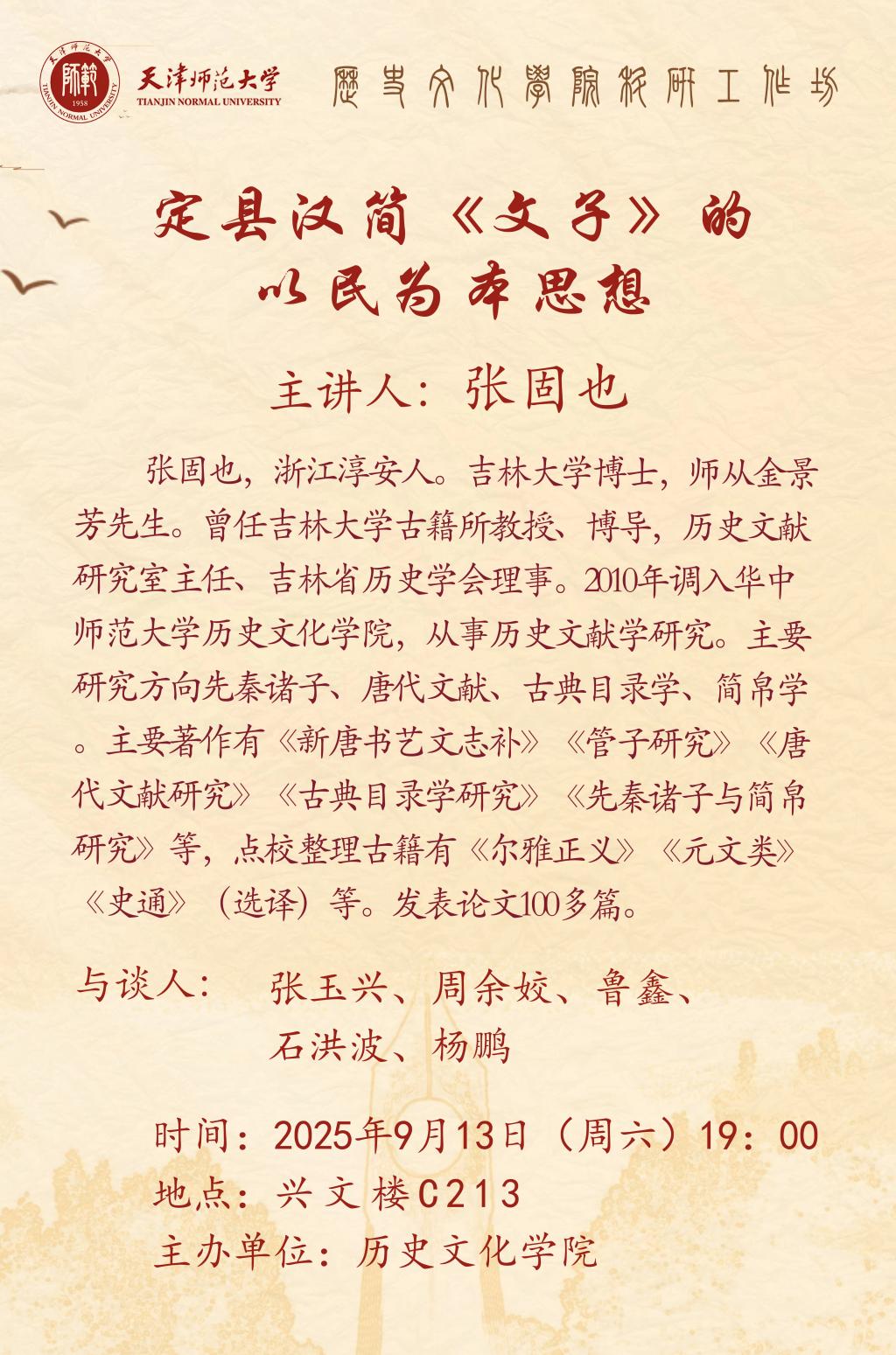 2025年9月13日,张固也教授将为师生带来题为《定县汉简<文子>的以民为本思想》的学术讲座,详情见海报。