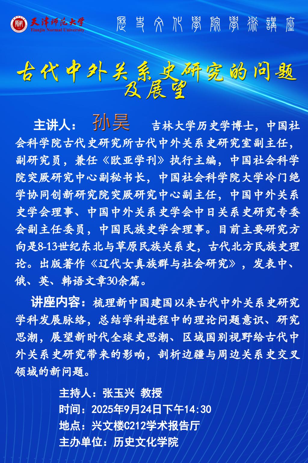 2025年9月24日,孙昊副研究员将为师生带来题为《古代中外关系史研究的问题及展望》的学术讲座,详情见海报。
