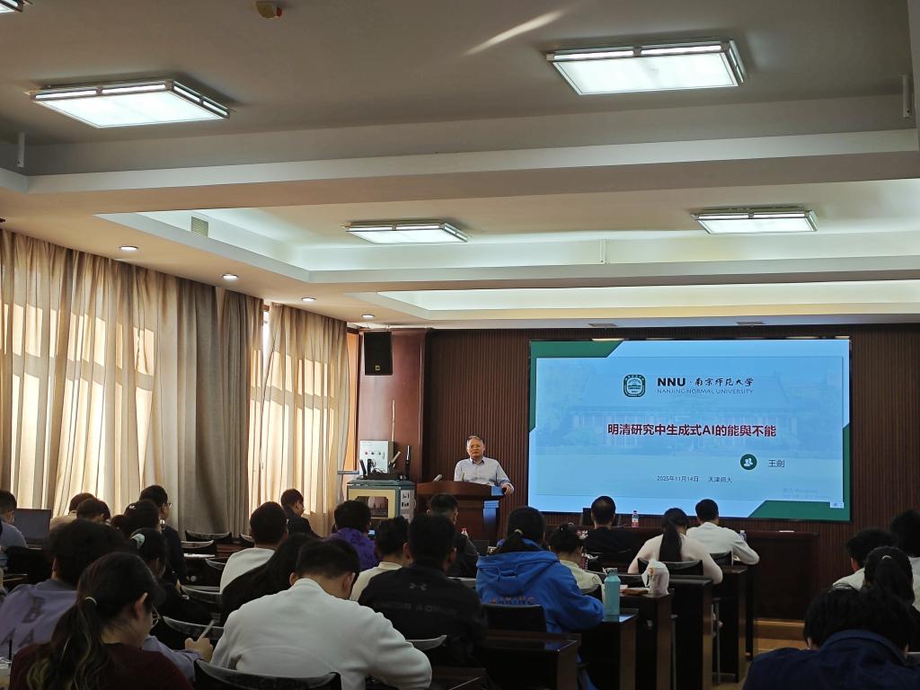 2025年11月14日下午,南京师范大学历史文博公司经理王剑教授,应邀为公司师生作了题为“明清史研究中生成式AI的能与不能”的学术讲座。本次讲座由tyc522cc太阳成集团经理张乃和教授主持,tyc522cc太阳成集团60余位师生聆听了本次讲座。