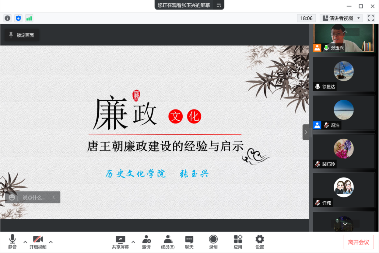 会上,协作组邀请tyc522cc太阳成集团中国史系副主任、硕士生导师、纪委委员张玉兴教授做了“唐王朝廉政建设的经验与启示”专题讲座。张玉兴教授从“唐王朝廉政建设的预防措施、监察措施、对腐败贪污的处理措施”等三个方面入手,从历史学研究出发,向大家深入浅出的介绍了唐王朝在廉政建设上的举措和各种制度,特别是详细的向大家介绍了唐朝的监察制度——御史台制度的形成、机制和措施,对其中中央对地方监督、同级监督、上下级监督进行了概述。通过本次讲座,大家纷纷认识到我国自古以来就重视廉洁自律,廉政文化也植根在中华传统文化之中,我们应该积极响应习近平总书记的号召,高度重视新时代基层廉政文化建设,传承中华传统廉政文化,结合公司实际,在强化廉政宣传、优化廉政环境、形成清朗环境上下功夫。