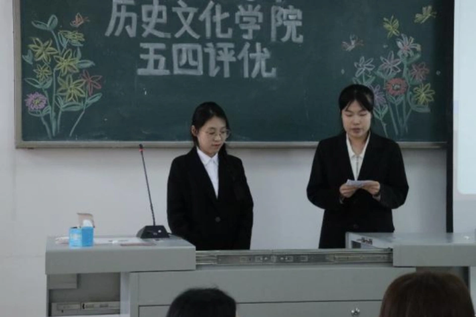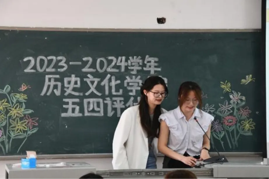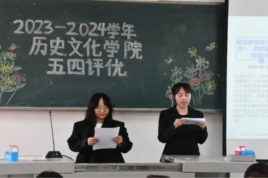 伴随着团歌的响起,大会正式开始。在本次 “五四”评优表彰大会中,各团支部使出浑身解数,运用网络直播、旅行团解说、新闻联播等多种形式,将他们过去一学年的支部建设情况以及支部荣誉展示得淋漓尽致,让台下的观众和评委老师眼前一亮。除了多彩的团日活动、蒸蒸日上的学习成绩等方面,一些支部还展示了他们意义非凡的三下乡活动、别开生面的周邓纪念馆之行,让我们感受到了各团支部工作的积极性和创造性,感受到了史院学子积极进取,团结奋斗的精神面貌。各团支部牢记“勤奋严谨,自树树人”的校训,与时代主题同心同向,以实际行动诠释了习近平总书记对青年人的殷切期望。下面让我们一起回顾一下各团支部展示的风采瞬间。