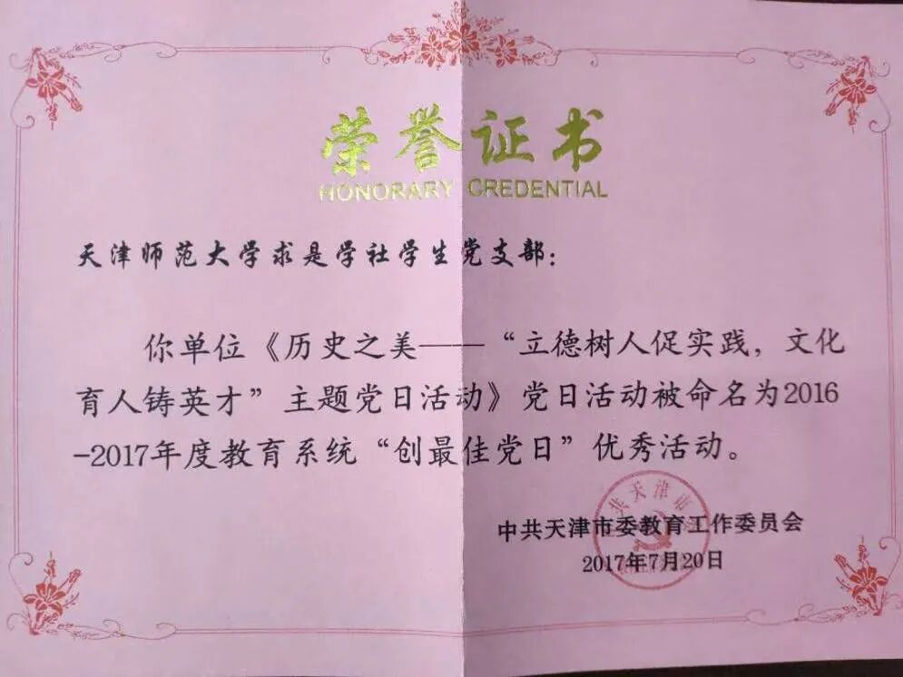 2017年,求是学社员工党支部《历史之美——“立德树人促实践,文化育人铸英才”主题党日活动》被命名为2016—2017年度教育系统“创最佳党日”优秀活动。