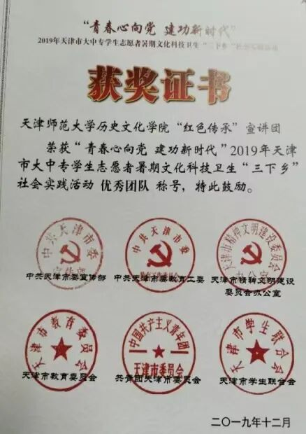 2019年12月,“红色传承”宣讲团获得天津市老员工暑期社会实践优秀团队称号。