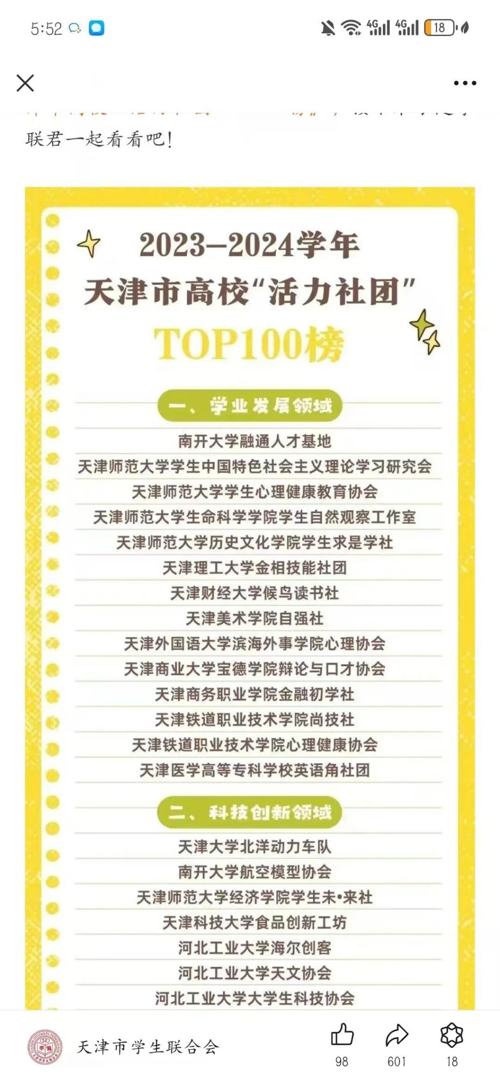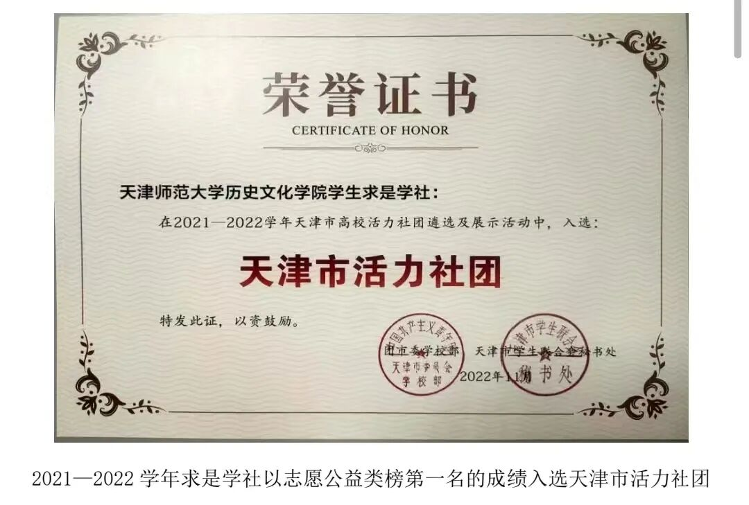 2021-2022学年度,获评天津市活力社团志愿公益类榜第一名。