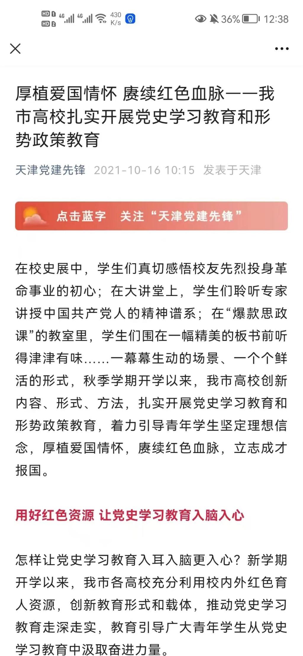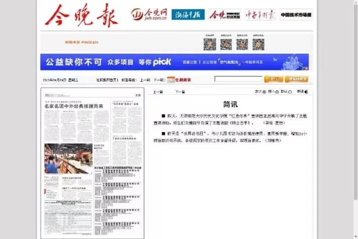 2019年4月,《今晚报》、腾讯大燕网刊登、报道“红色传承”宣讲团走进海河中学开展主题宣讲活动。