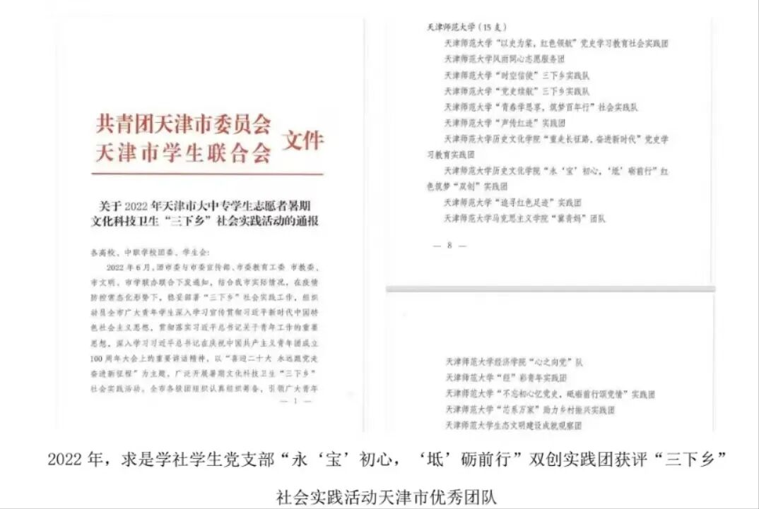 2022年,“永‘宝’初心,‘坻’砺前行”红色筑梦“双创”实践团获得天津市暑期三下乡社会实践先进团队。