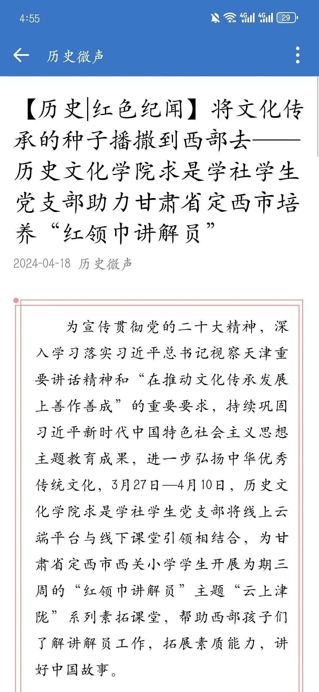 2024年4月,“红领巾讲解员”主题“云上津陇”系列素拓课堂。
