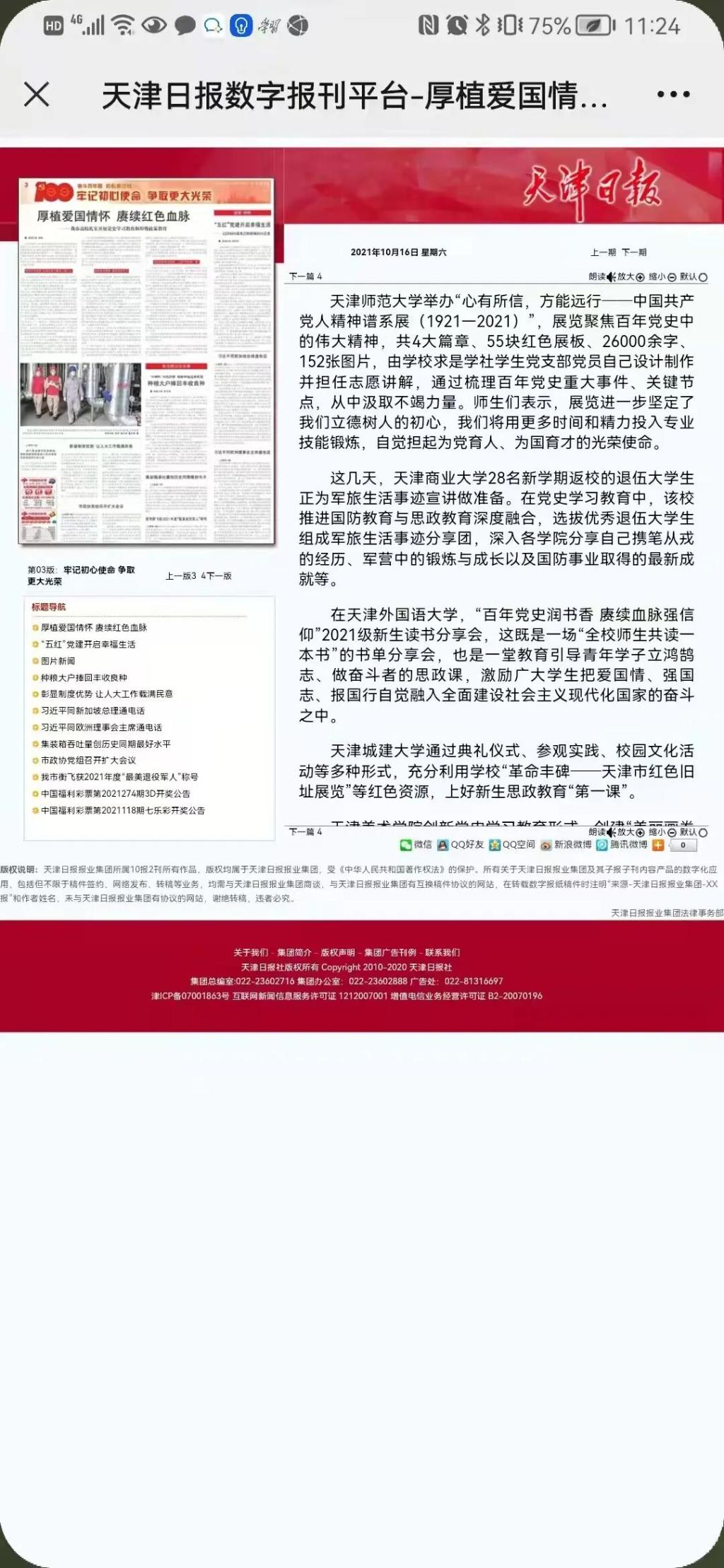 2019年11月,《天津教育报》报道求是学社与红色文化育人基地联合承办的“波澜壮阔七十年革命信仰筑青春”话剧节。