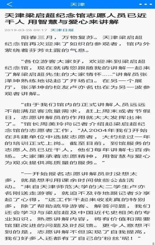 2019年3月,天津日报登载《天津梁启超纪念馆志愿人员已近千人用智慧与爱心来讲解》。