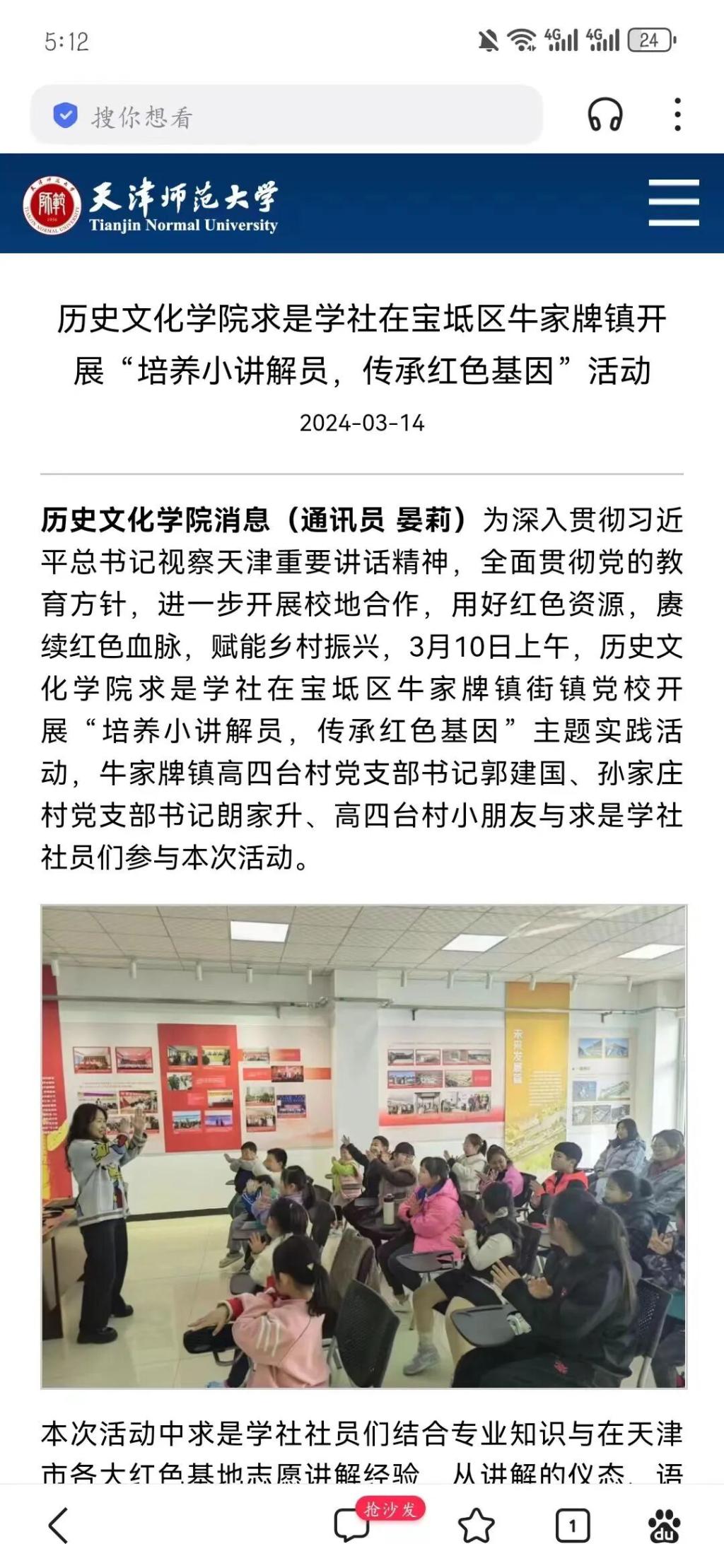 2024年3月起,在宝坻区牛家牌镇开展“培养小讲解员,传承红色基因”系列活动。