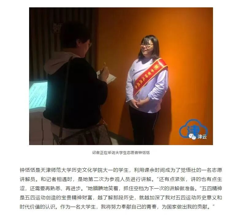 2019年5月,津云推送《百年觉悟社今日网红地在天津五四精神这样传承》,记者采访求是学社觉悟社志愿者。