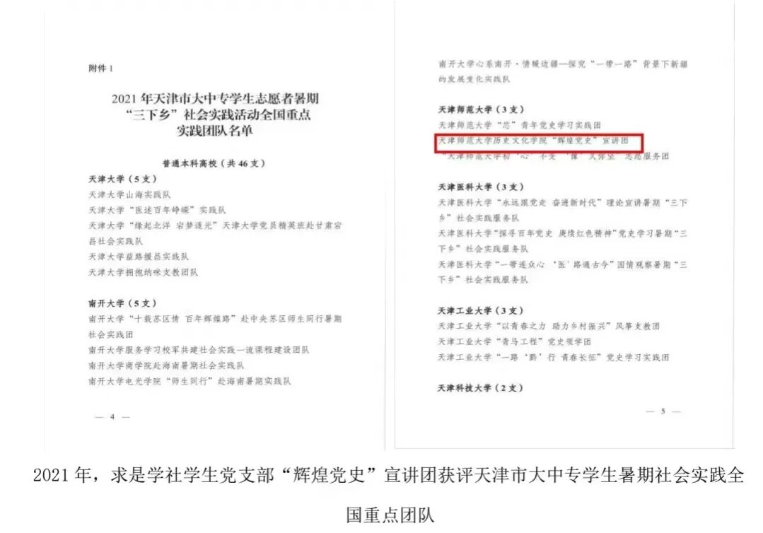 2021年,“辉煌党史”宣讲团获得天津市暑期三下乡社会实践先进团队。