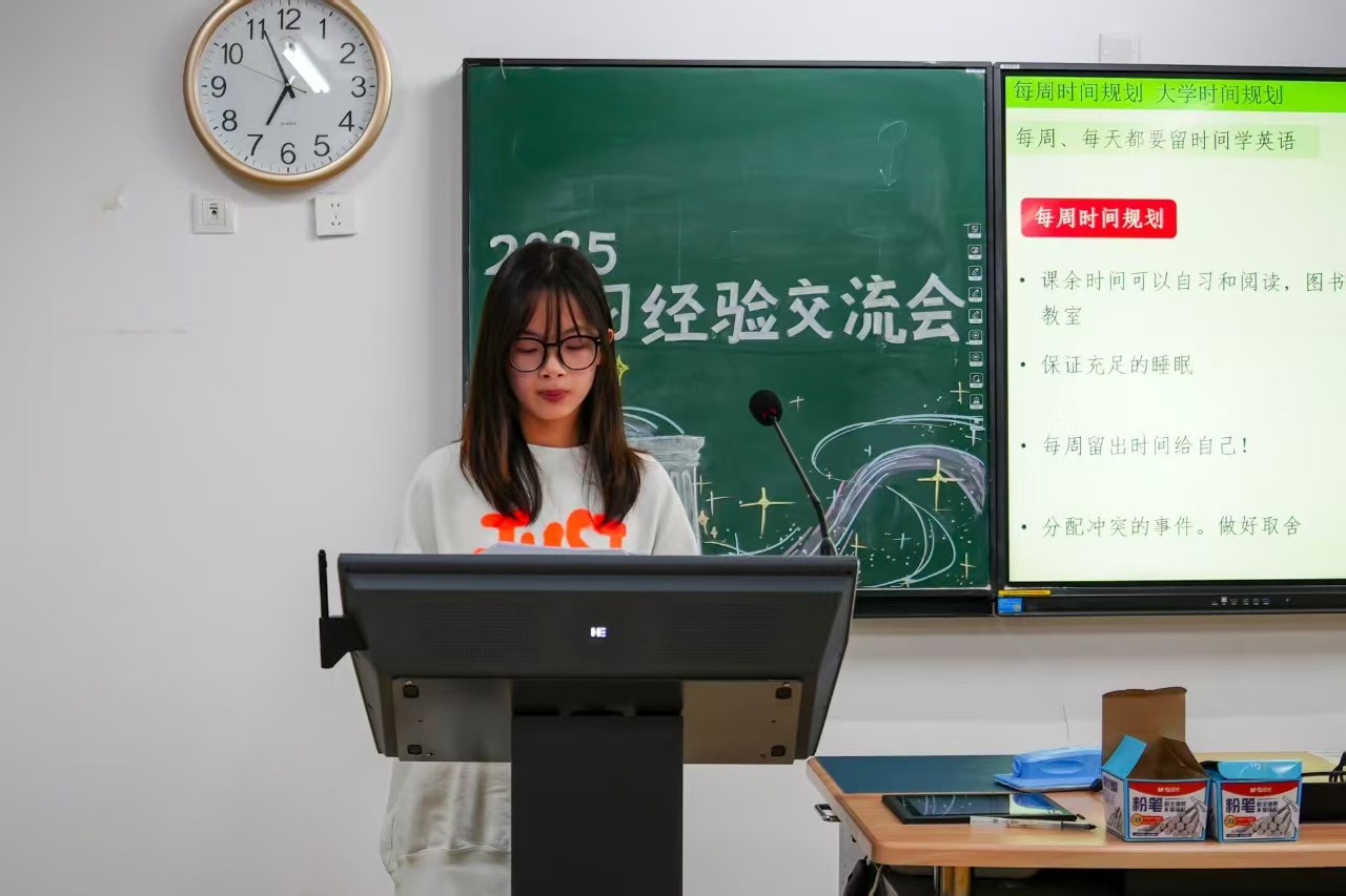 蒋有祺学姐从确定目标、日常学习与期末复习等多方面分享经验。学姐建议目标设定应该分宏观和细分两个层次,可以涉及保研、考研、考公等方向,还需关注保研信息、学科竞赛等。同时学姐强调课堂学习不能松懈,要利用日程表和提醒工具避免挂科。学姐提出考试复习要做好规划。最后学姐强调同学们应该平衡学习与生活,鼓励大家体验多元挑战。