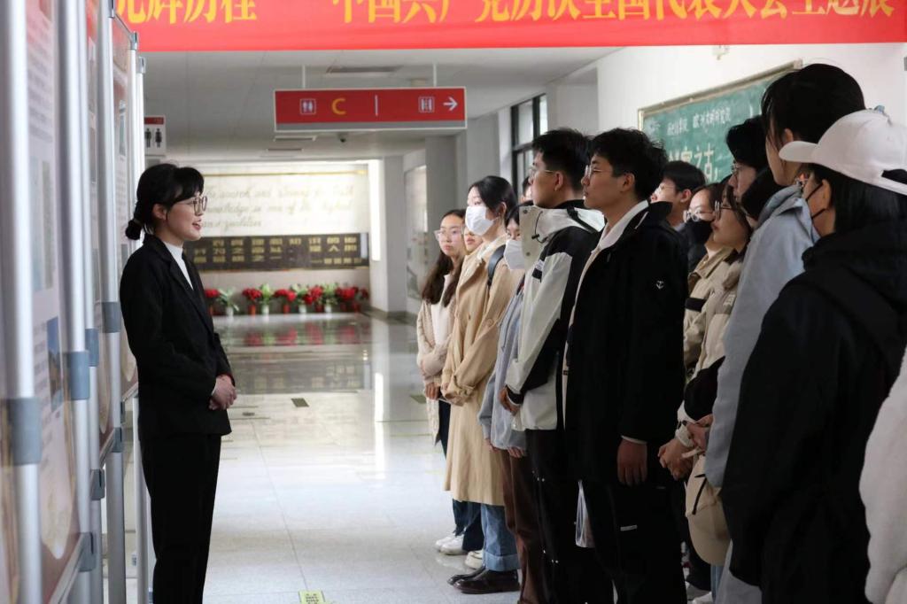 为深入学习宣传贯彻党的二十大精神,扎实推动党的二十大精神深入校园,教育引领员工坚定理想,树立目标,听党话、跟党走,tyc522cc太阳成集团“青年马克思主义者培养工程”培训班全体学员、理论研究会全体成员于3月24日中午参观了由历史文化公司党委、红色文化育人基地主办,tyc522cc太阳成集团求是学社员工党支部承办的“光辉历程——中国共产党历次全国代表大会主题展”,活动邀请了求是学社成员担任讲解员。