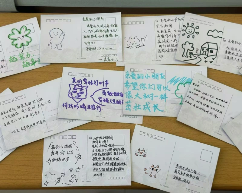 明信片创作是本次活动的重要环节。同学们在明信片上写下真挚的祝福,明信片的边边角角也被同学们用心地绘满了五彩的图案。这些明信片将跨越山川,送到山区儿童的手中,让同学们与山区儿童建立情感连接,传递温暖与鼓励。使员工在放松身心的同时,深刻领悟到关爱他人的深远意义,实现心理育人的目标。